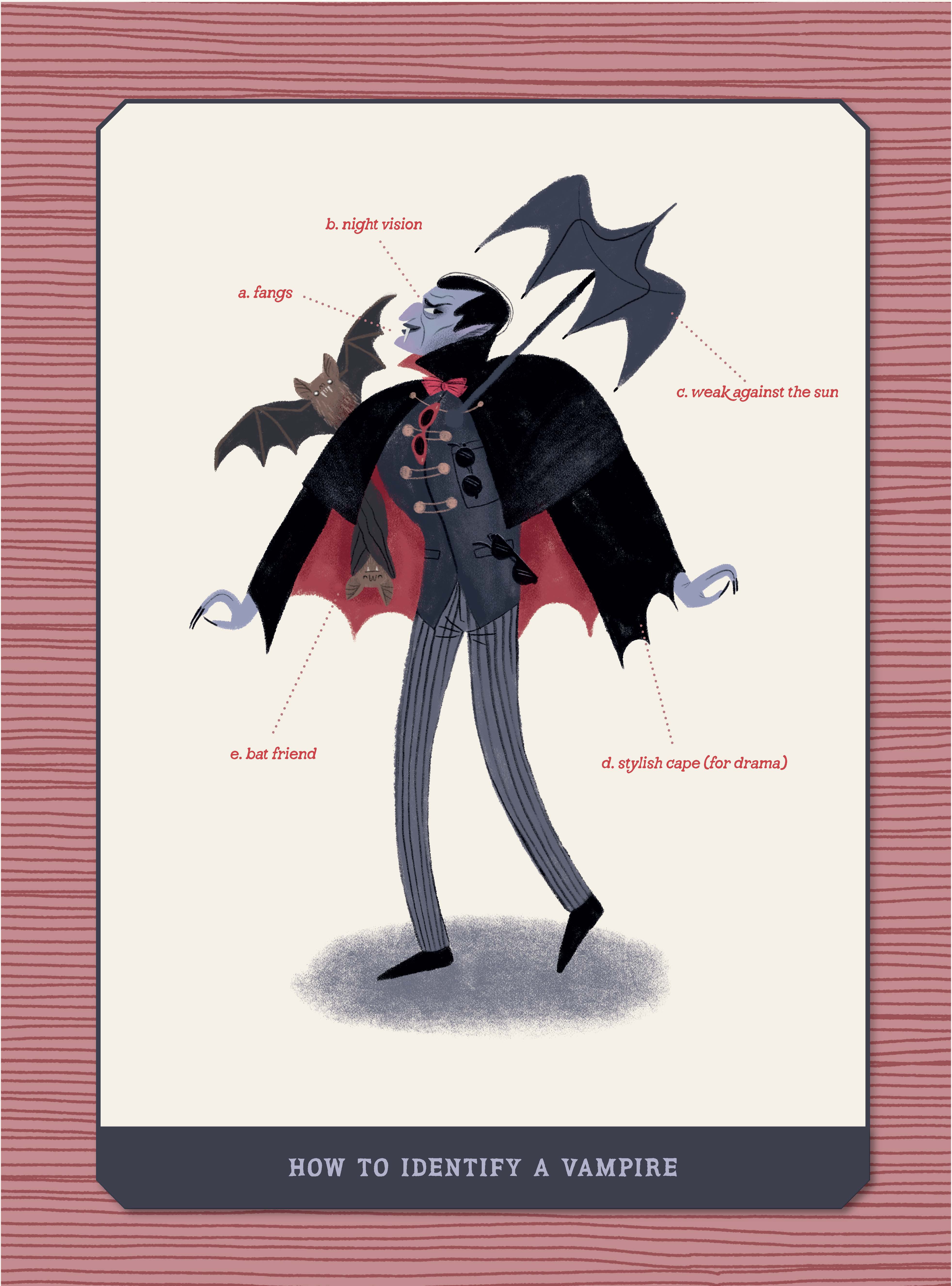 The first step for me especially was to get the notes from my editor and just research, research, research! To dive deep into what we as fans of vampires know about them and then what other people think about them. And those perspectives shift so much after a while because you get Bela Lugosi, then Blade, then you get Edward Cullen. So it's an all over spectrum. But the one thing that I love is being able to learn about everything. That's the stage where we also created the tone of the book where we want to make it approachable for kids in order to be like, "Hey, if you want to grab this guide and go out into the world of vampires, you're never going to be alone. In any case, like, whatever monster you come upon, like, right?" It has to be funny enough for a kid to understand it but then also a little bit serious for kids to also be like, "Oh, this science fact is really cool." Then we added the aspects of how we did Twilight, kind of showing that yeah this thing is cool and this thing is awesome but there is a problematic side.