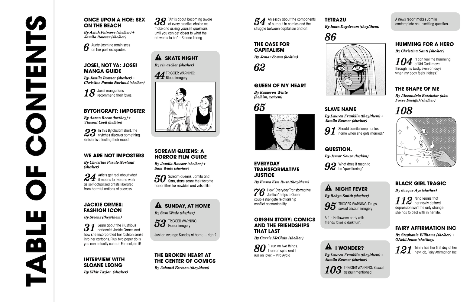 That was another one of the most stressful parts of creating the magazine! That was probably the most stressful part because I just want to create the art. I got this grant, so I don't have to worry about losing money. But I do want people to like it. At first I was like, "Should it be themed, like anthologies? If it's themed then people will know what's going to be in it." The other option was to just have people do whatever they want, and hope that that's fine. Then it's on me to put it in order and curate it in a way that makes sense. Ultimately that's what I wanted, for people to do what they wanted, no themes. So it's really like art versus capitalism and the market. Am I trying to make this because I want it to be marketable? Or do I just want to make it for the sake of the art? That's when I realized, why would I stray from what I do? I never make anything or publish anybody because I think it's going to make a lot of money or be popular in that way.